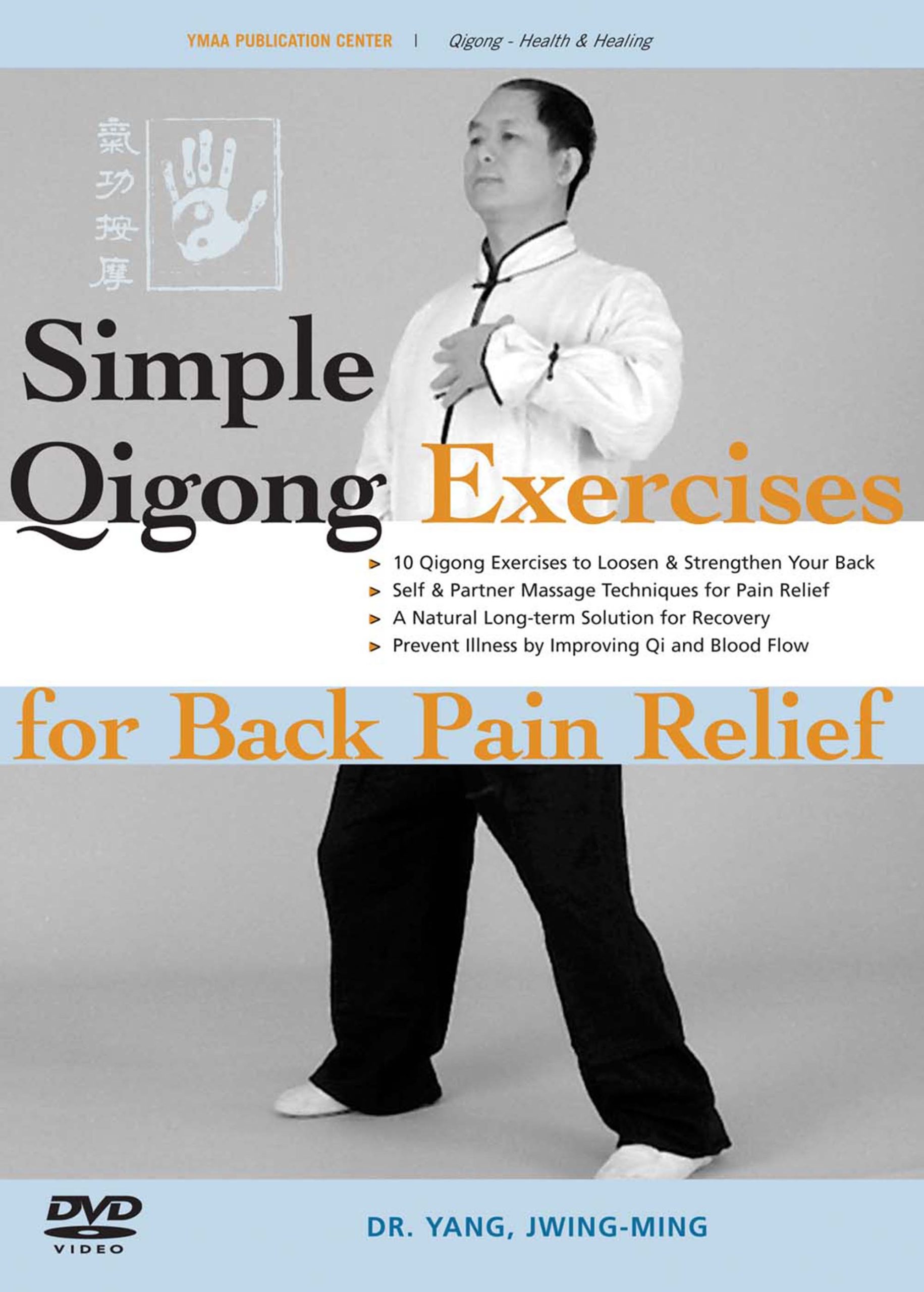Simple Qigong Exercises for Back Pain Relief (DVD) by Dr. Yang, Jwing-Ming -- Dr. Yang then presents ten gentle qigong exercises to help ease your lower back pain, strengthen your torso, and expedite your body’s natural healing. The exercises are simple to learn and enjoyable to practice, and you can easily follow along with Dr. Yang's demonstration. The movements can be practiced both sitting or standing.